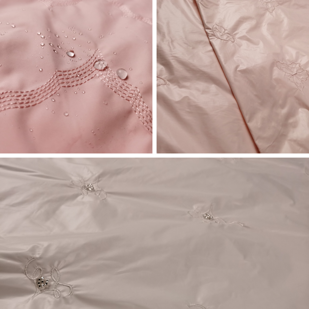 這種面料具有很好的防水和防鉆絨、防跑棉的能力,面料手感整體輕薄,柔軟,有豎皺感。仿扎染的特性,使得色彩清新溫和,可以染成馬卡龍色系,很適合制作成兒童以及青少年的羽絨服、棉服、以及外套。不拘季節(jié),隨時隨地,可愛自然。