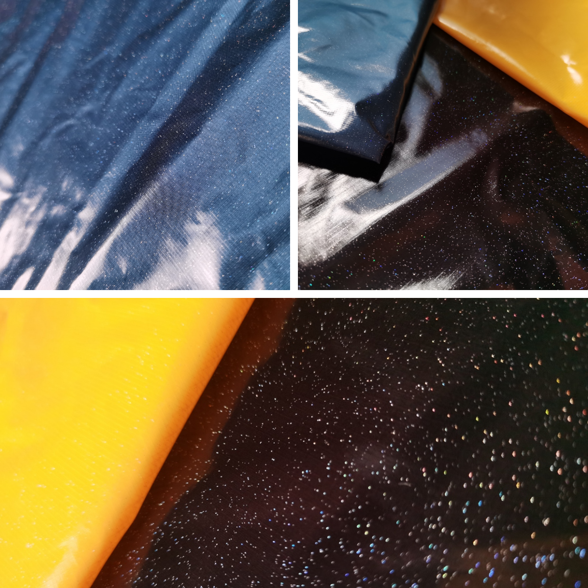 這種面料表面具有鏡面,閃光的特點,耀眼奪目,精致浪漫。質(zhì)地有點偏硬,具有很強的立體感和可塑性,耐高水壓的特性,成就了面料的堅韌不易損壞。表面的閃光點很像星空中忽明忽暗的恒星,很好的迎合了年輕人的喜好。
