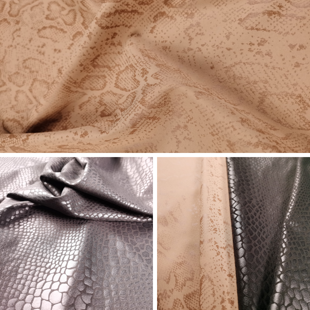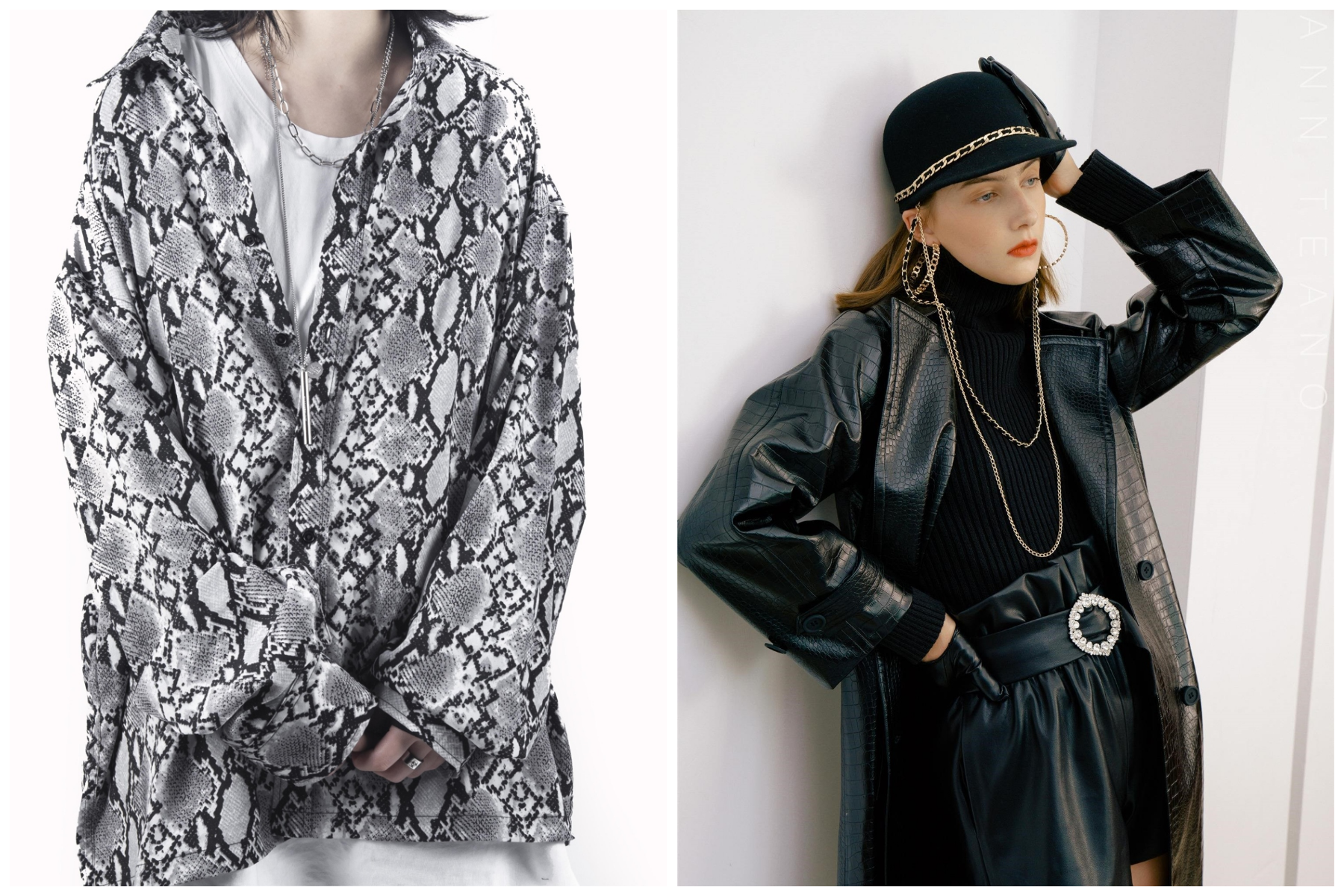 這種面料手感柔軟,具有皮質(zhì)感,彈性適中,表面的動物花紋給此款面料增加了低調(diào)慢熱又狂野冷艷的靈魂。此種動物花紋中,蟒蛇紋最為突出,它可一直都是潮流的寵兒,復(fù)古大氣,浮夸中性,而且不難駕馭。無論是上衣、褲子、外套、鞋子、配飾等等,都很受消費者喜愛。